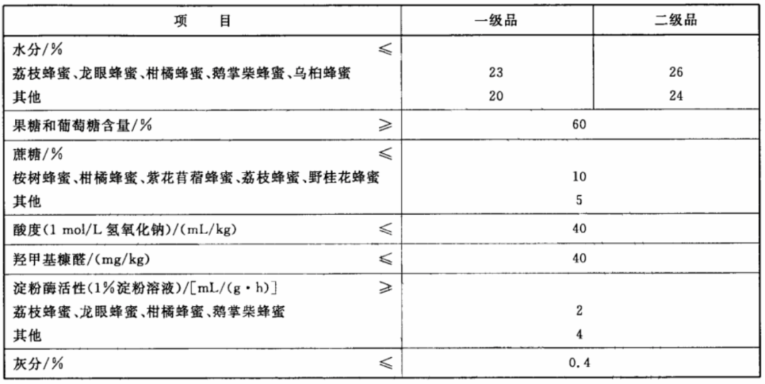 《食品安全国家标准 蜂蜜》(GB 14963-2011 )对蜂蜜产品的理化指标、污染物限量、微生物限量等方面提出了要求,《蜂蜜》(GH/T 18796-2012)则将此类产品按指标细分为了两级质量等级。