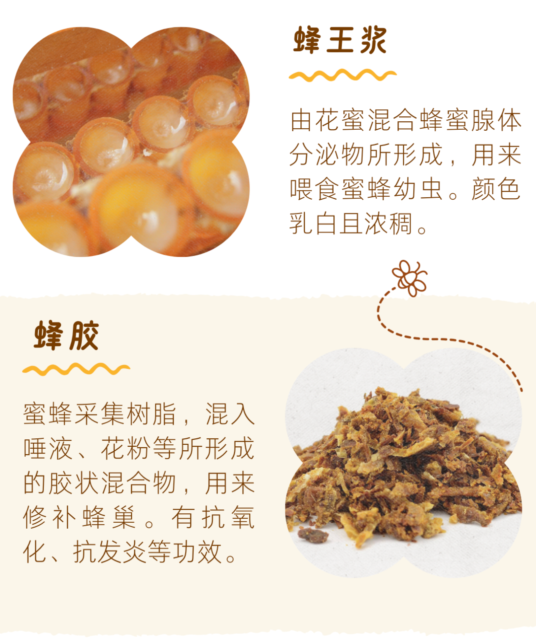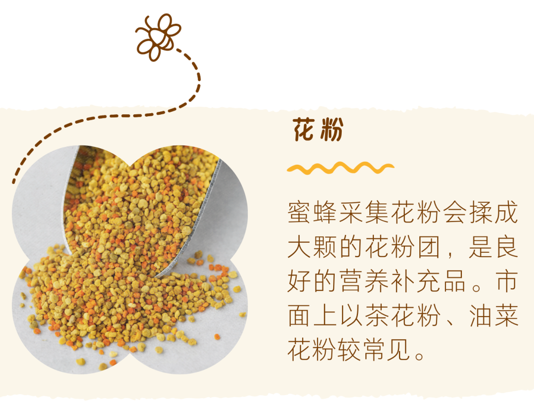 除了蜂蜜以外,还有其他蜂产品,如花粉、蜂王乳和蜂胶,其形式和功用都不一样。