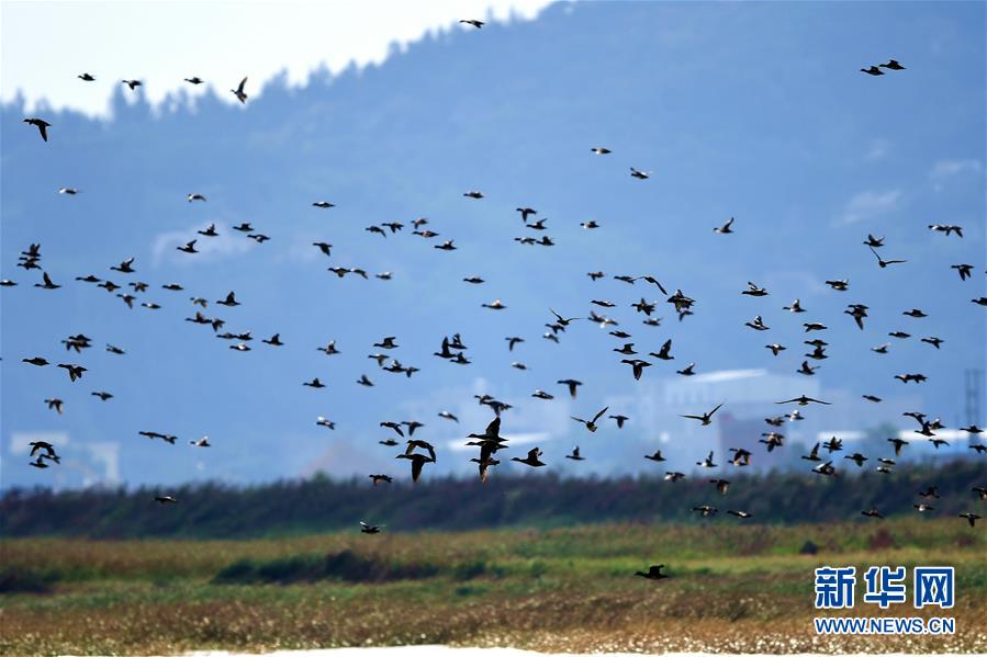 11月1日,一群黑脸琵鹭在湿地上空飞翔。