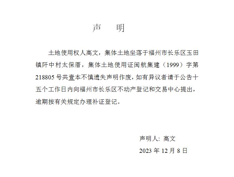 高文土地证遗失声明