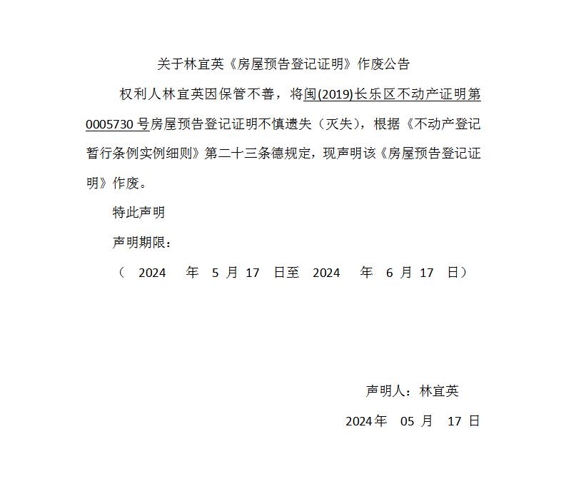 林宜英预告证遗失声明