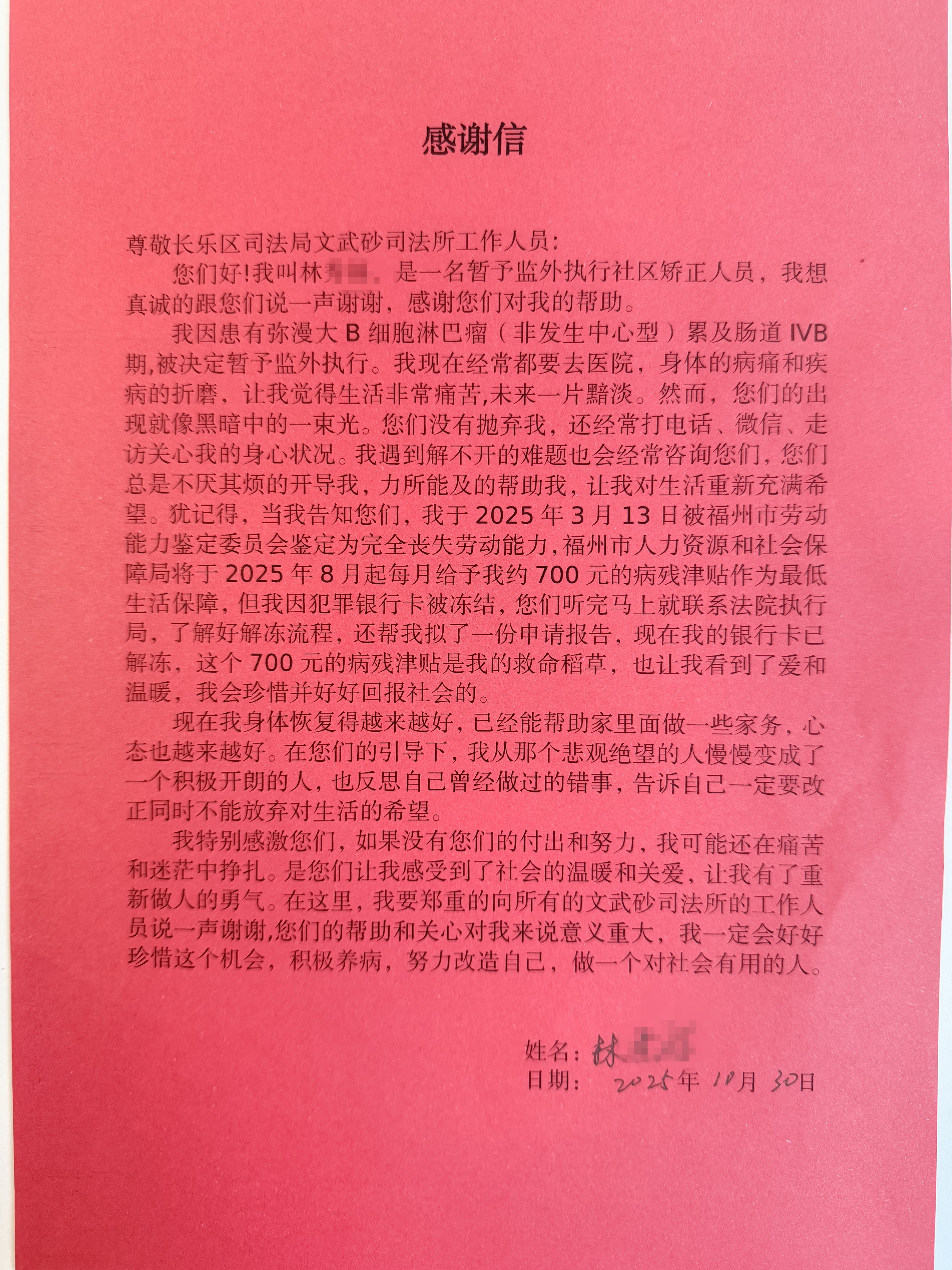 文武砂司法所根据实际情况为林某某量身制定了矫正方案。在日常监管中,工作人员坚持执法与人性关怀并重,常常通过电话、微信和走访,关心其思想动态和生活状况,鼓励他乐观面对病痛。当得知福州市劳动能力鉴定委员会已于2025年3月13日将林某某鉴定为完全丧失劳动能力,市人社局将于2025年8月起每月发放约700元病残津贴作为基本生活保障,林某某却因银行卡被冻结而陷入困境时,司法所第一时间联系法院执行局,详细了解解冻流程,并主动帮其撰写申请材料。在司法所的协助下,银行卡顺利解冻。这笔津贴不仅是林某某的生活保障,更让其感受到社会的温暖与不抛弃、不放弃的爱。