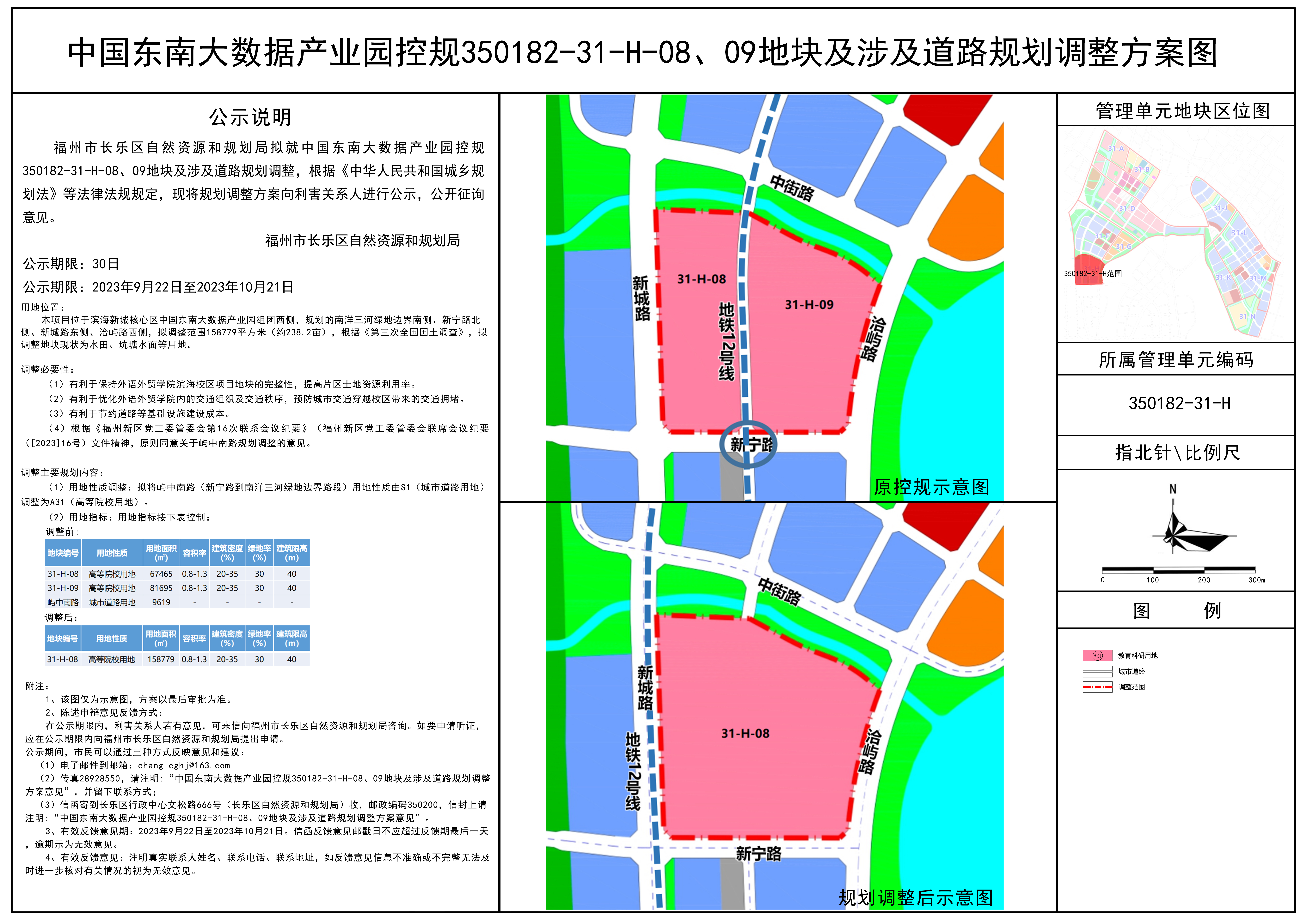 3、信函寄到长乐区行政中心文松路666号(长乐区自然资源和规划局)收,邮政编码350200,信封上请注明“中国东南大数据产业园控规350182-31-H-08、09地块及涉及道路规划调整方案意见”。