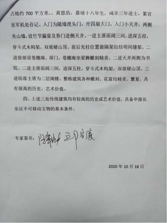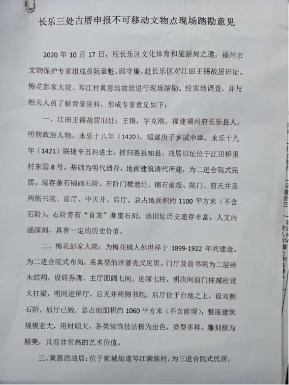 福州市长乐区文化体育和旅游局关于确定黄恩浩故居等3处古厝为我区尚未核定公布为文物保护单位的不可移动文物的通知