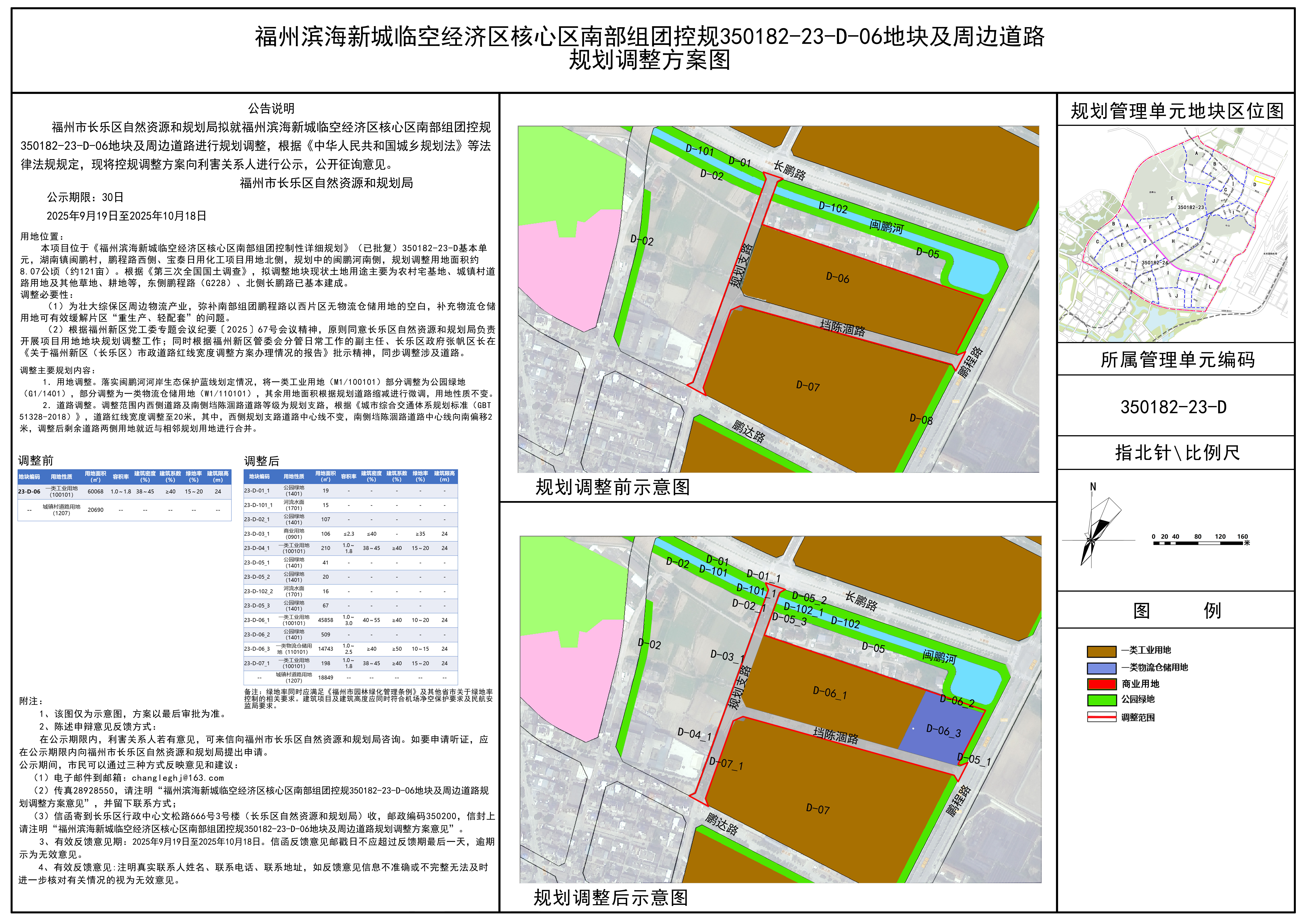 3、信函寄到长乐区行政中心文松路666号3号楼(长乐区自然资源和规划局)收,邮政编码350200,信封上请注明“福州滨海新城临空经济区核心区南部组团控规350182-23-D-06地块及周边道路规划调整方案意见”。