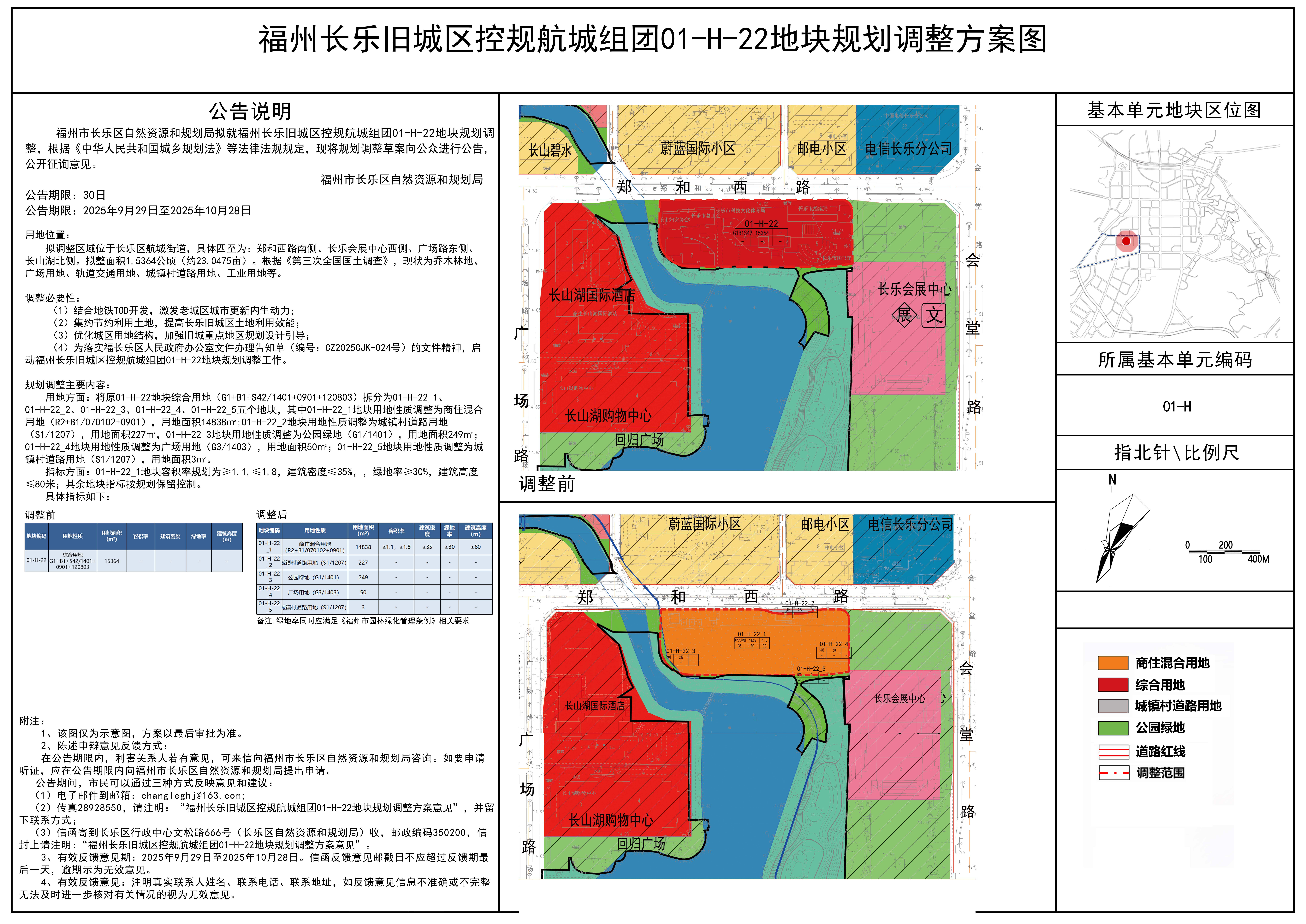 3、信函寄到长乐区行政中心文松路666号(长乐区自然资源和规划局)收,邮政编码350200,信封上请注明“福州长乐旧城区控规航城组团01-H-22地块规划调整意见”。