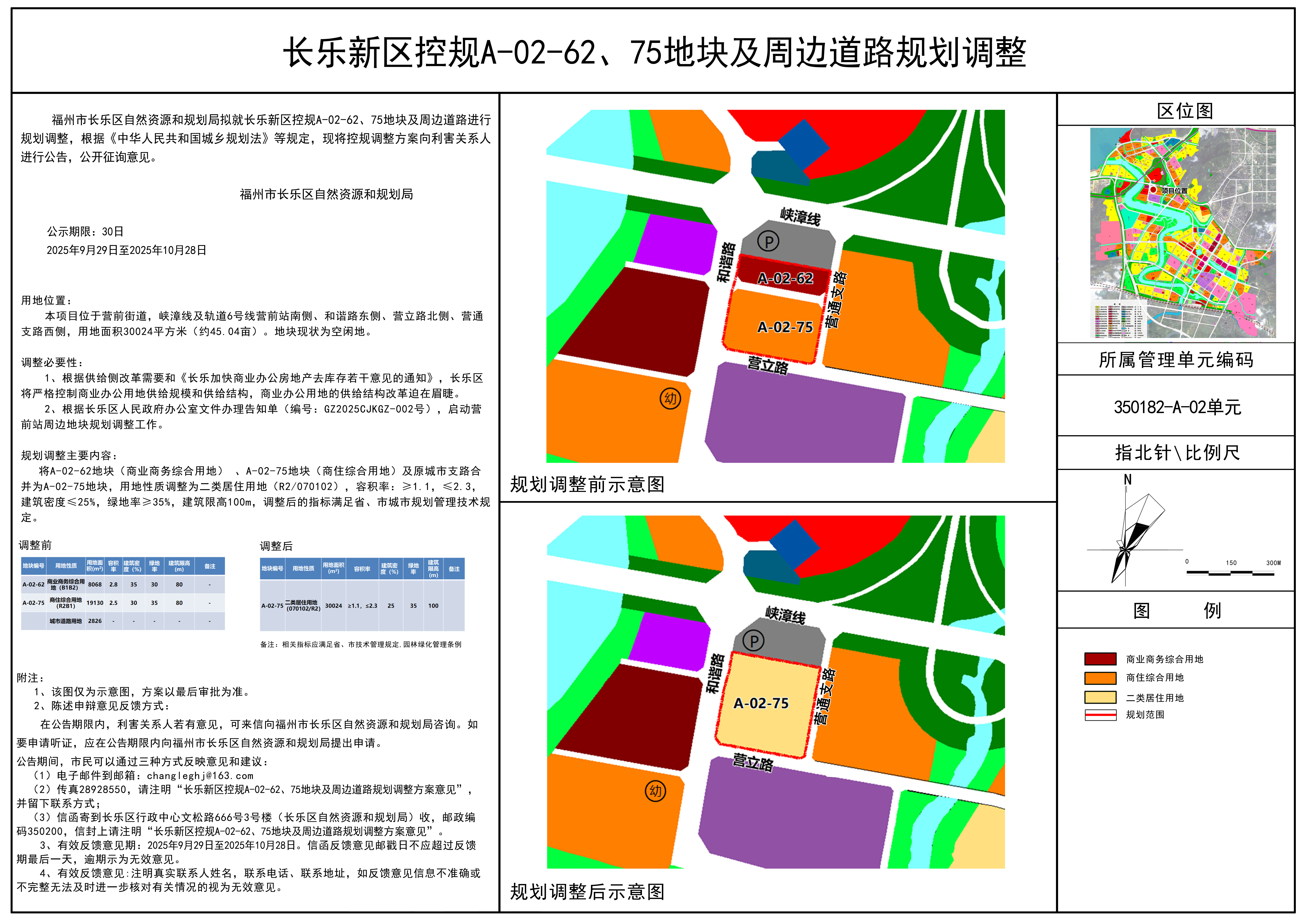 3、信函寄到长乐区行政中心文松路666号(长乐区自然资源和规划局)收,邮政编码350200,信封上请注明“长乐新区控规A-02-62、75地块及周边道路规划调整”。