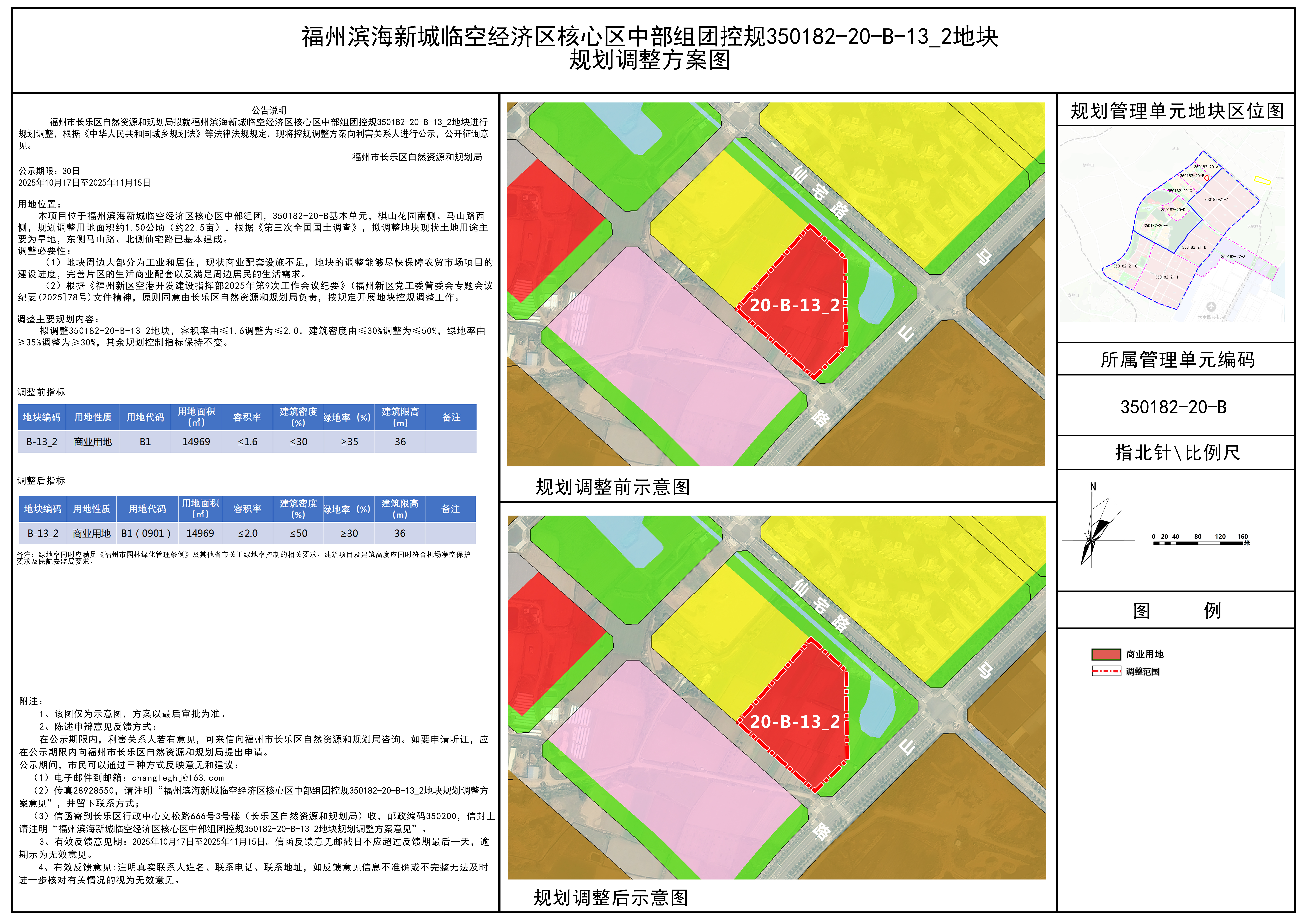 根据《福州新区空港开发建设指挥部2025年第9次工作会议纪要》(福州新区党工委管委会专题会议纪要〔2025〕78号)文件精神,原则同意由长乐区自然资源和规划局负责,按规定开展福州滨海新城临空经济区核心区中部组团控规350182-20-B-13_2地块规划调整工作。现控规调整工作已按程序启动,于2025年10月17日通过专家评审会。根据《中华人民共和国城乡规划法》、《福建省城市控制性详细规划管理暂行办法》及《福州市人民政府办公厅关于进一步规范规划用地管理的实施意见》(榕政办〔2020〕29 号)文件,现公告如下: