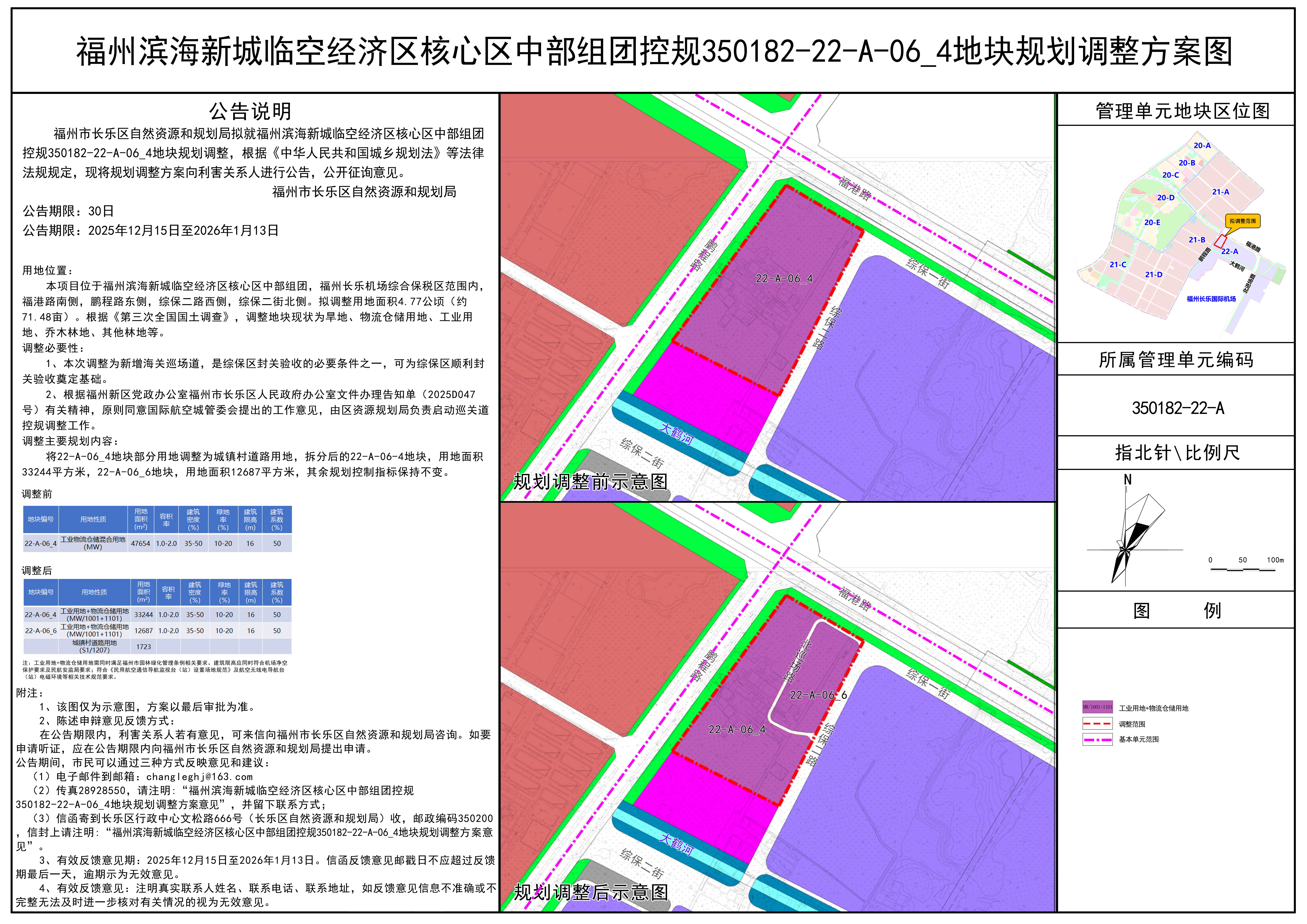 3、信函寄到长乐区行政中心文松路666号(长乐区自然资源和规划局)收,邮政编码350200,信封上请注明“福州滨海新城临空经济区核心区中部组团控规350182-22-A-06_4地块规划调整方案意见”。