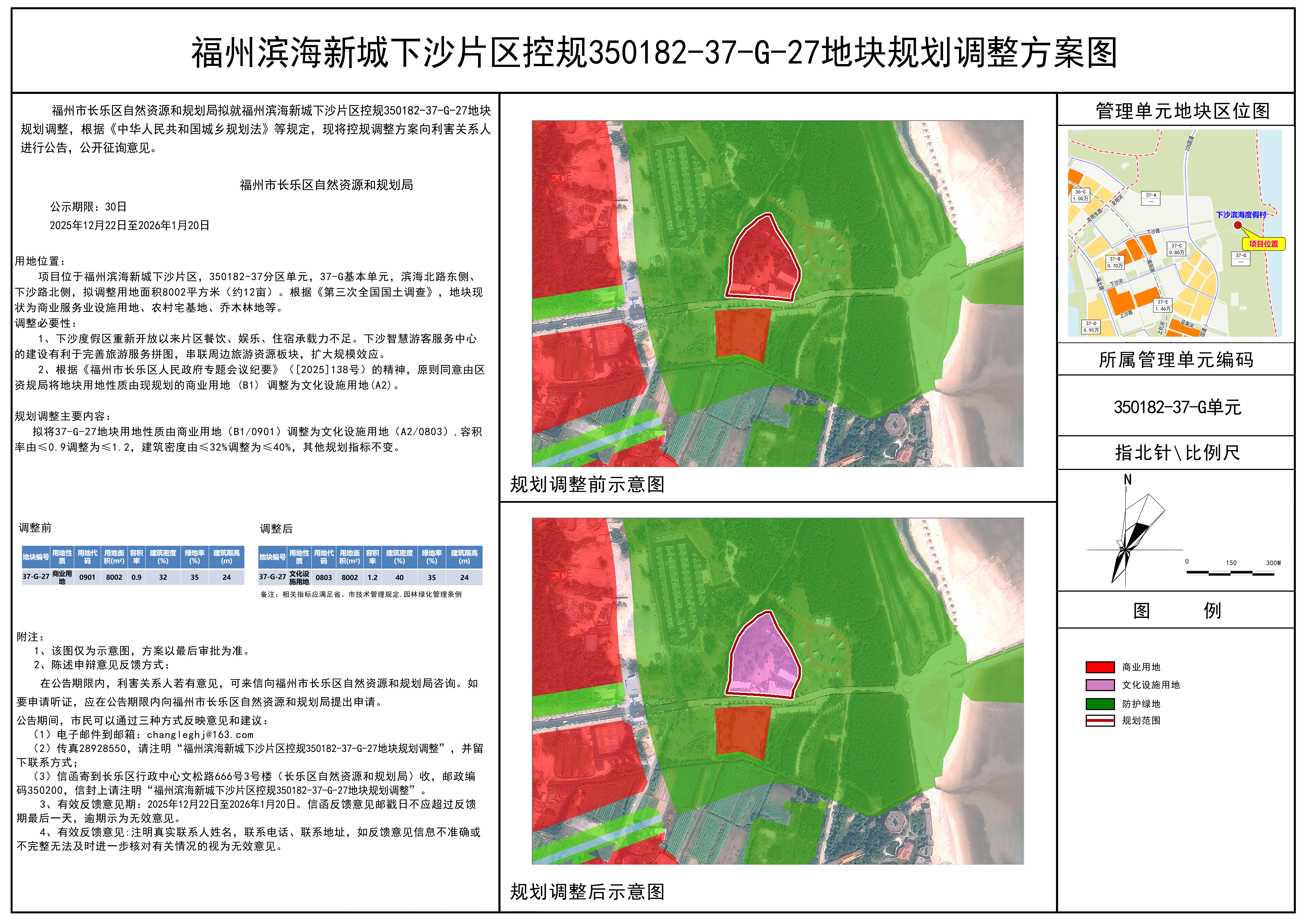 3、信函寄到长乐区行政中心文松路666号3号楼(长乐区自然资源和规划局)收,邮政编码350200,信封请注明“福州滨海新城下沙片区控规350182-37-G-27地块规划调整方案意见”。