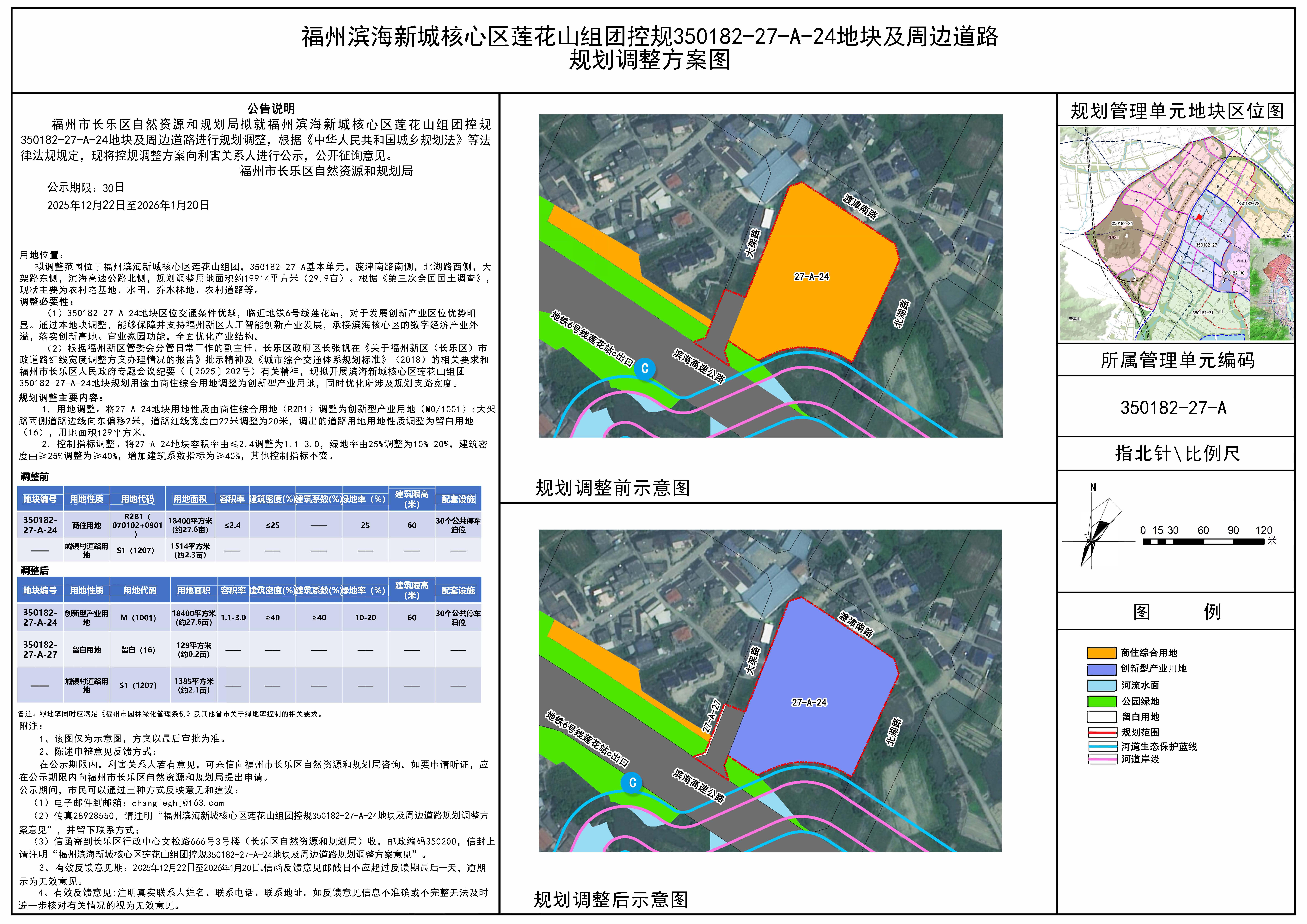 3、信函寄到长乐区行政中心文松路666号3号楼(长乐区自然资源和规划局)收,邮政编码350200,信封上请注明“福州滨海新城核心区莲花山组团控规350182-27-A-24地块及周边道路规划调整方案意见”。