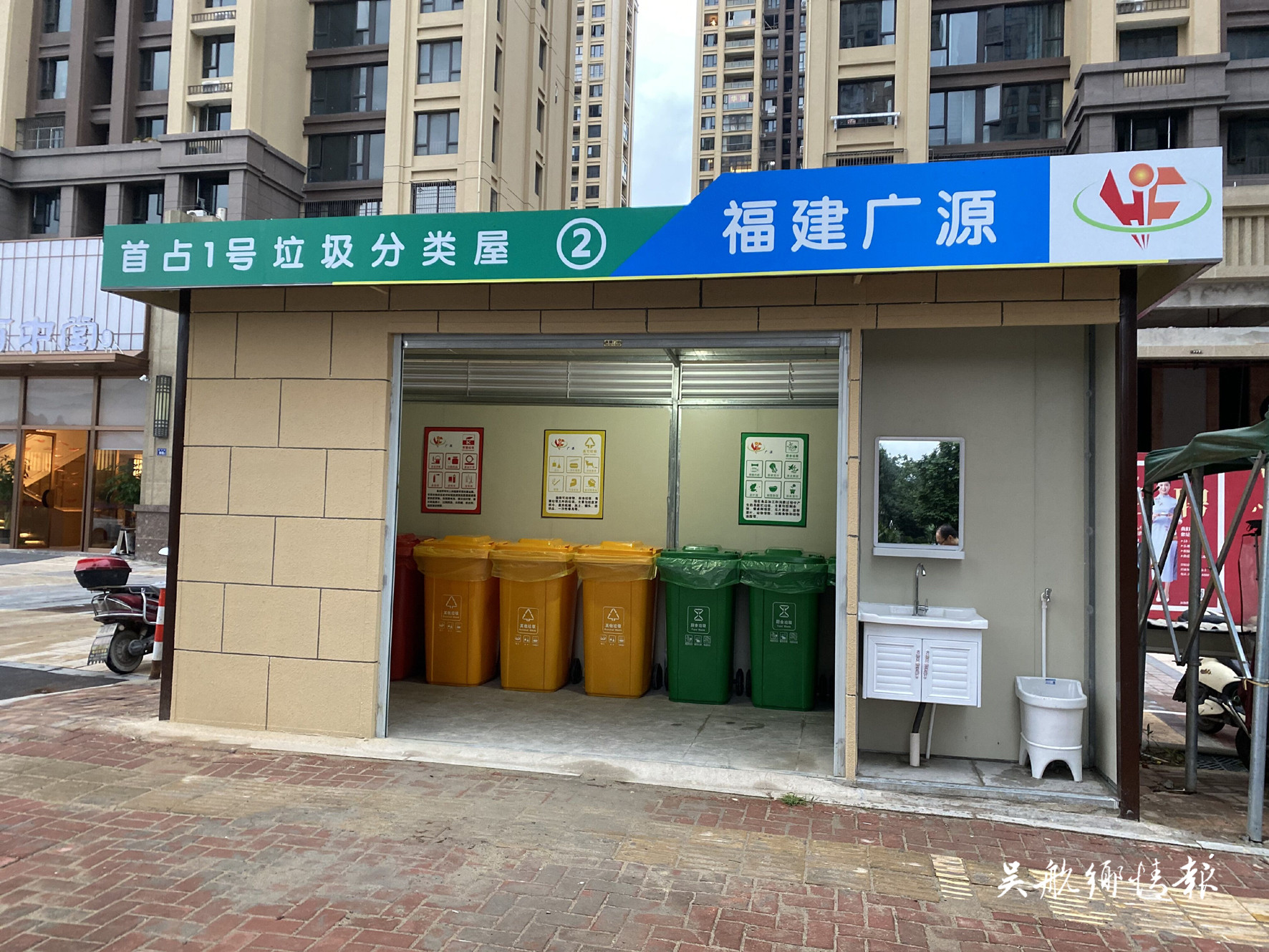 在首占一号,记者看到一座造型美观大方的垃圾分类屋已建好,小屋占地面积近13平方米,配有宣传板、分类垃圾桶、洗手池、镜子、抹布和洗桶区域。同时,垃圾分类屋还将安排管理员日常进行清理打扫等工作。