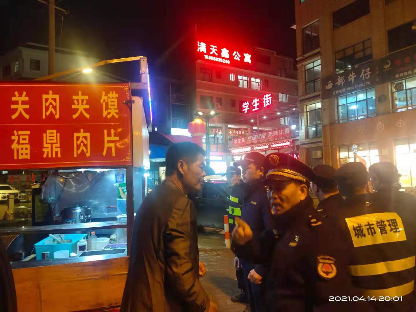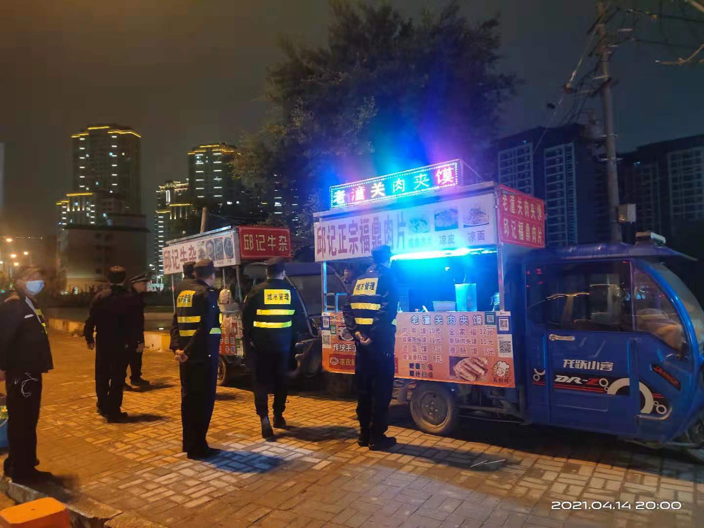 4月14日夜间,城建监察大队市容中队组织执法人员和协管人员共10人,对首占新区中南樾府附近进行突击检查,共计查处违法占道经营行为2起,暂扣占道经营摊车2辆,有效遏制了夜市流动摊贩反弹回潮现象。