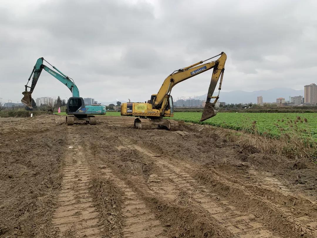 现场多台挖掘机正在进行河道开挖作业,施工人员火力全开,积极投入到该项目建设中,确保顺利完成各项施工任务。