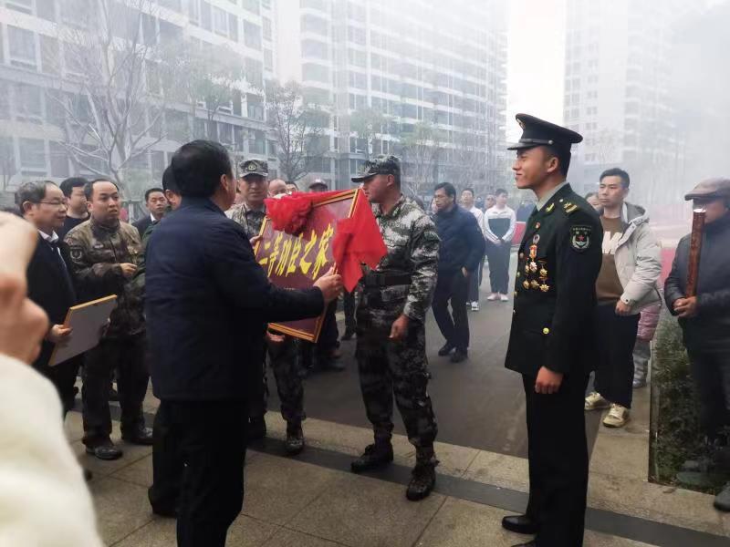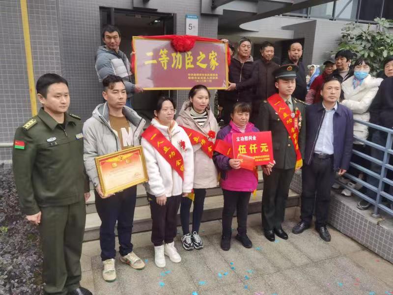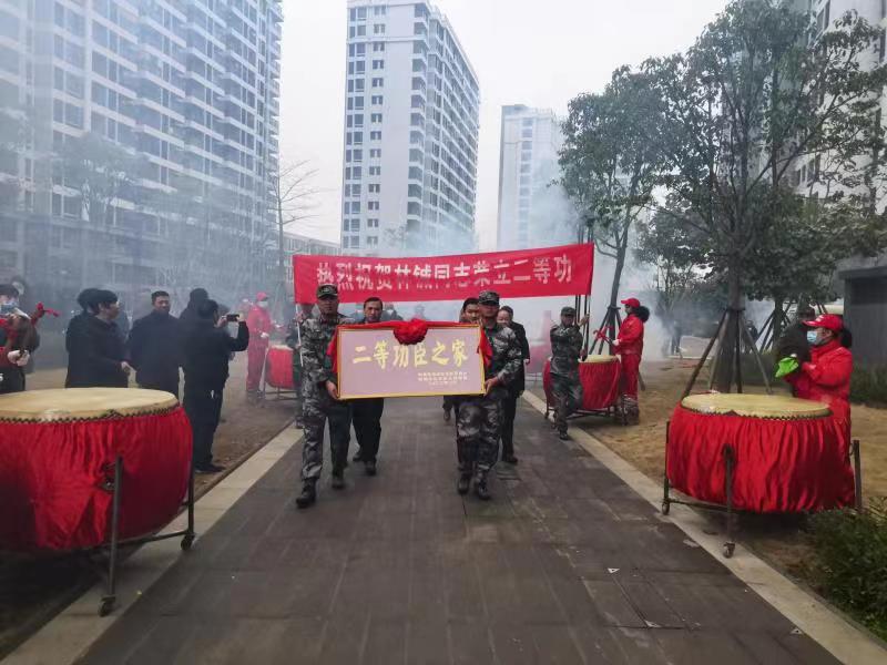 在热闹喜庆的氛围中,慰问组一行来到林铖同志一家的楼下,陈航星副区长宣读立功喜报,刘超部长为林铖及其家人戴上光荣绶带和红花,送上“二等功臣之家”牌匾及慰问金。随后慰问组对林铖同志爱岗敬业、报效祖国表示崇高敬意,对林铖同志在国际性军事比赛中获得第一名并被授予二等功表示祝贺,对林铖家属一直以来对孩子、对部队、对国家的大力支持和默默付出表示感谢。