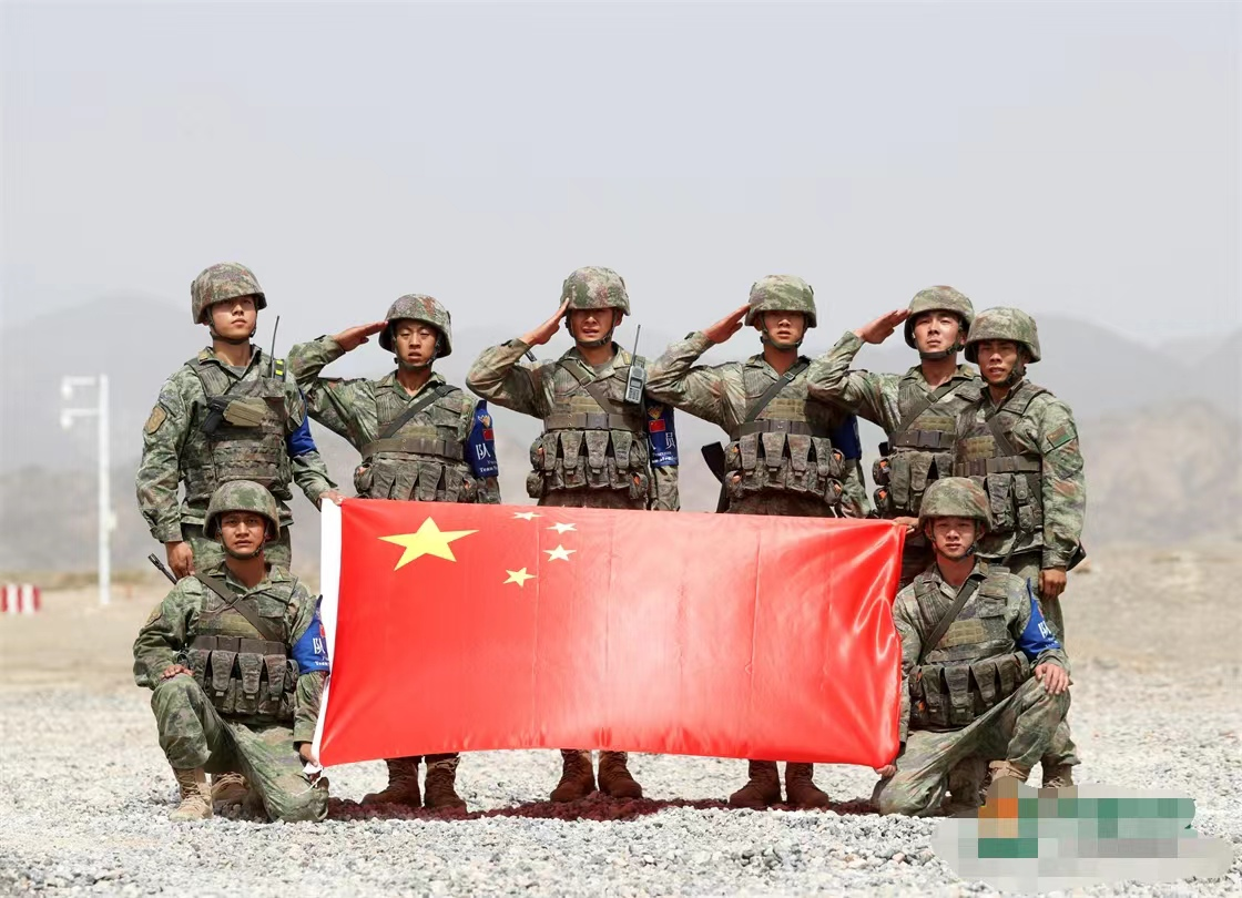 “国际军事比赛—2022”中国库尔勒赛区进行“安全路线”单项赛架桥组比赛,中国参赛队员展示国旗。(林铖后排左数第一个)