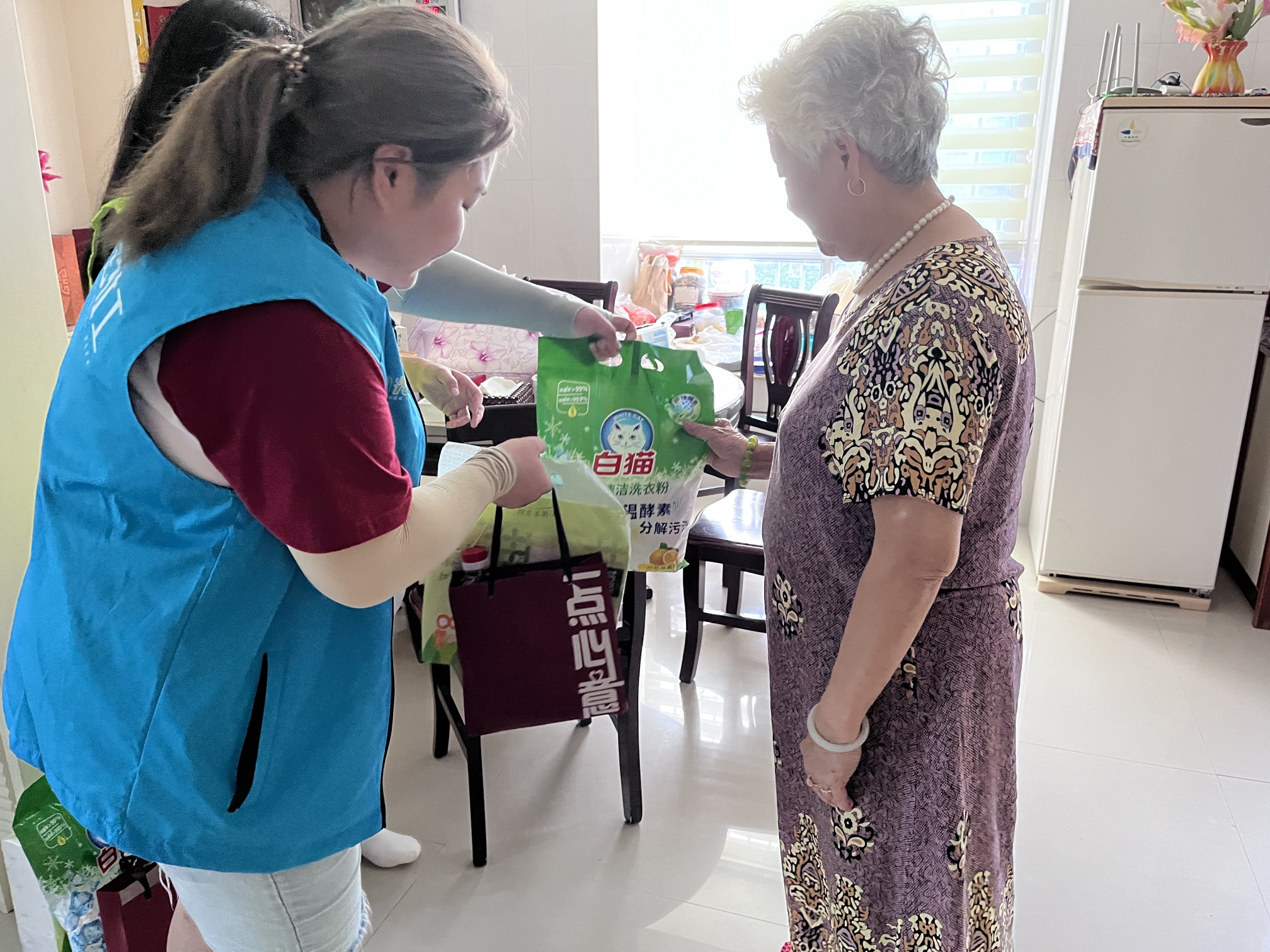 社工为探访的老人准备了“一点心意”小礼盒、洗衣粉以及纸巾等生活用品,老人们脸上洋溢着幸福的微笑,都表示很感谢社区的关心。