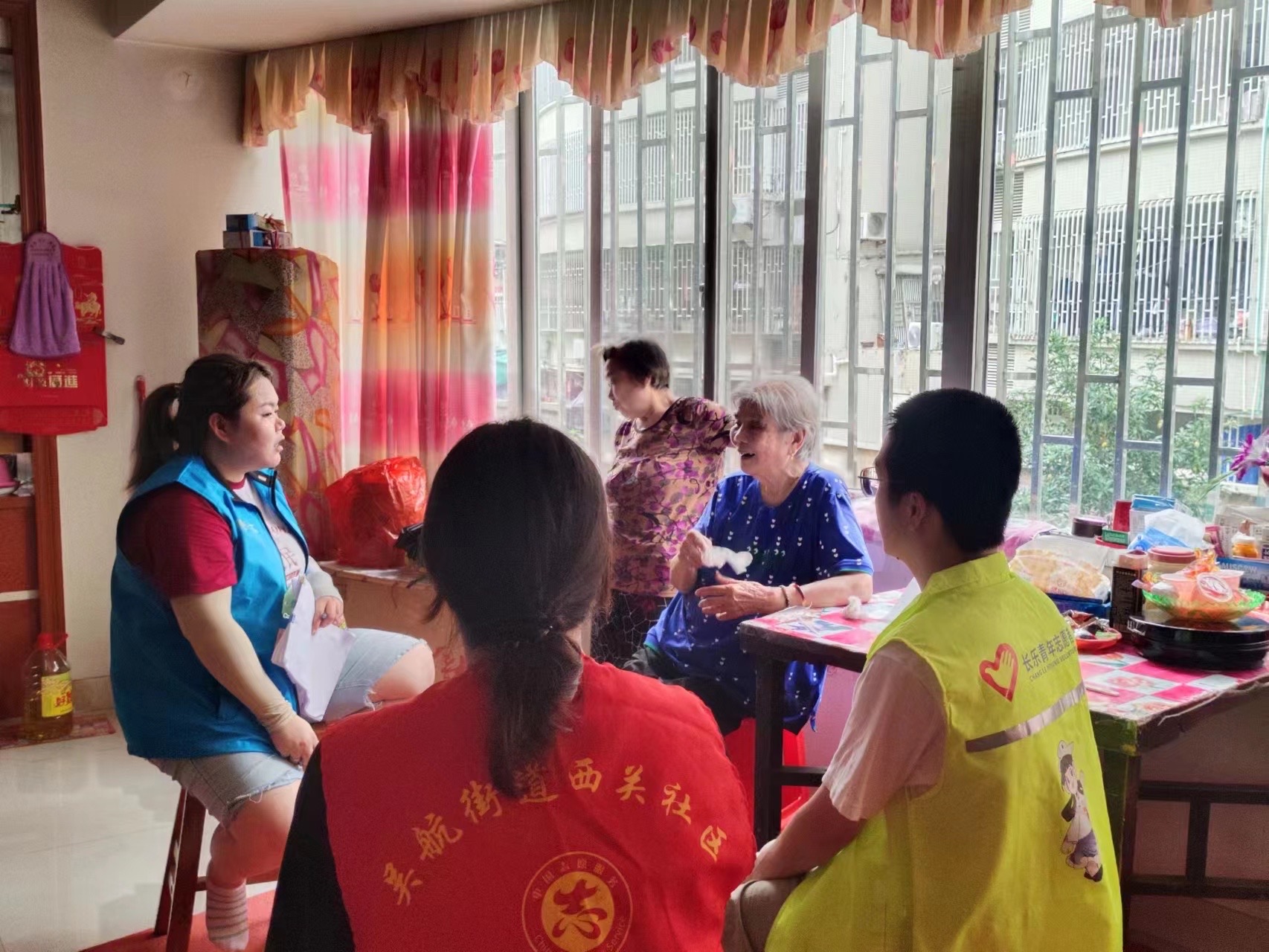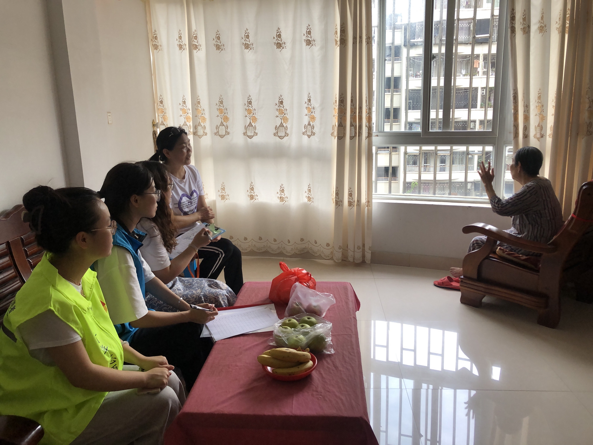 我们探访的邹奶奶,独居多年,由于腿脚不便除买菜外很少出门,偶尔有楼上的邻居来串门,社区组织的活动也没有参加过。我们去到邹奶奶家中时,正好有一位邻居在她家中做客,志愿者们了解情况后,向邹奶奶介绍社区活动并鼓励她参加,邹奶奶了解后也表示之后社区通知时间会积极参加,也能够多交些朋友。