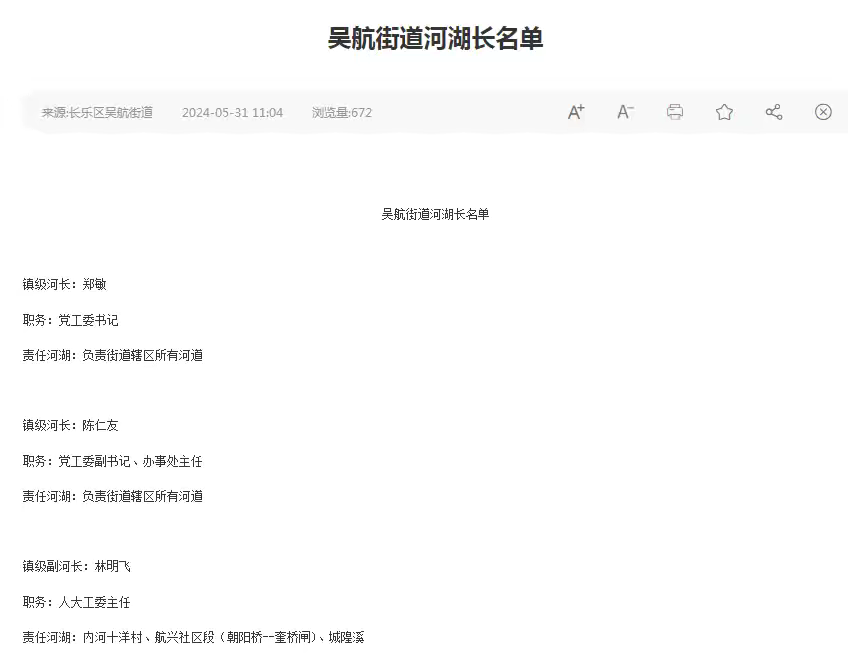 为加强河湖监督管理,强化河长制工作党政领导负责制,吴航街道结合实际情况,更新并在政府网站公告街道河长名单及所负责流域,确保工作不断档,责任不缺位,任务不松懈。