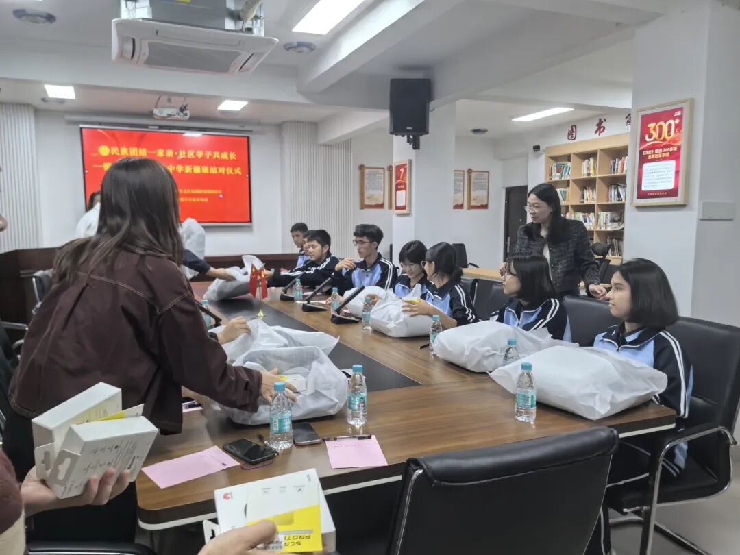 仪式上,结对的社区干部志愿者与新疆班学生互相赠送 “结对卡”。卡片上详细记录着双方的姓名、联系方式和兴趣爱好,为后续常态化沟通与精准帮扶打下坚实基础。锦辉社区文明实践站还为每位学生准备了精心挑选的暖心礼物,一句句问候、一份份心意,让现场氛围格外温馨热烈。