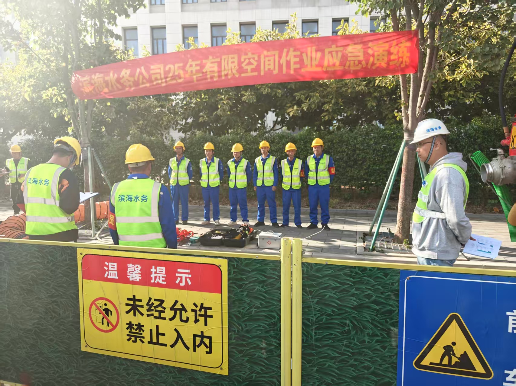 2025 年 11 月 21 日下午,区住建局联合滨海水务公司,于滨海新区下横楼路现场开展有限空间实操培训暨应急演练活动。本次活动聚焦有限空间作业全流程安全管控核心要点,通过理论讲解与实操演示相结合的方式,详细规范了气体检测仪、正压式呼吸器、安全绳等关键设备的使用方法及标准操作流程。此次培训与演练兼具针对性与实用性,有效强化了项目管理人员及外协队伍的安全责任意识,显著提升了其安全业务素养与应急处置实操技能,为辖区内有限空间作业安全生产平稳有序推进筑牢了坚实基础。
