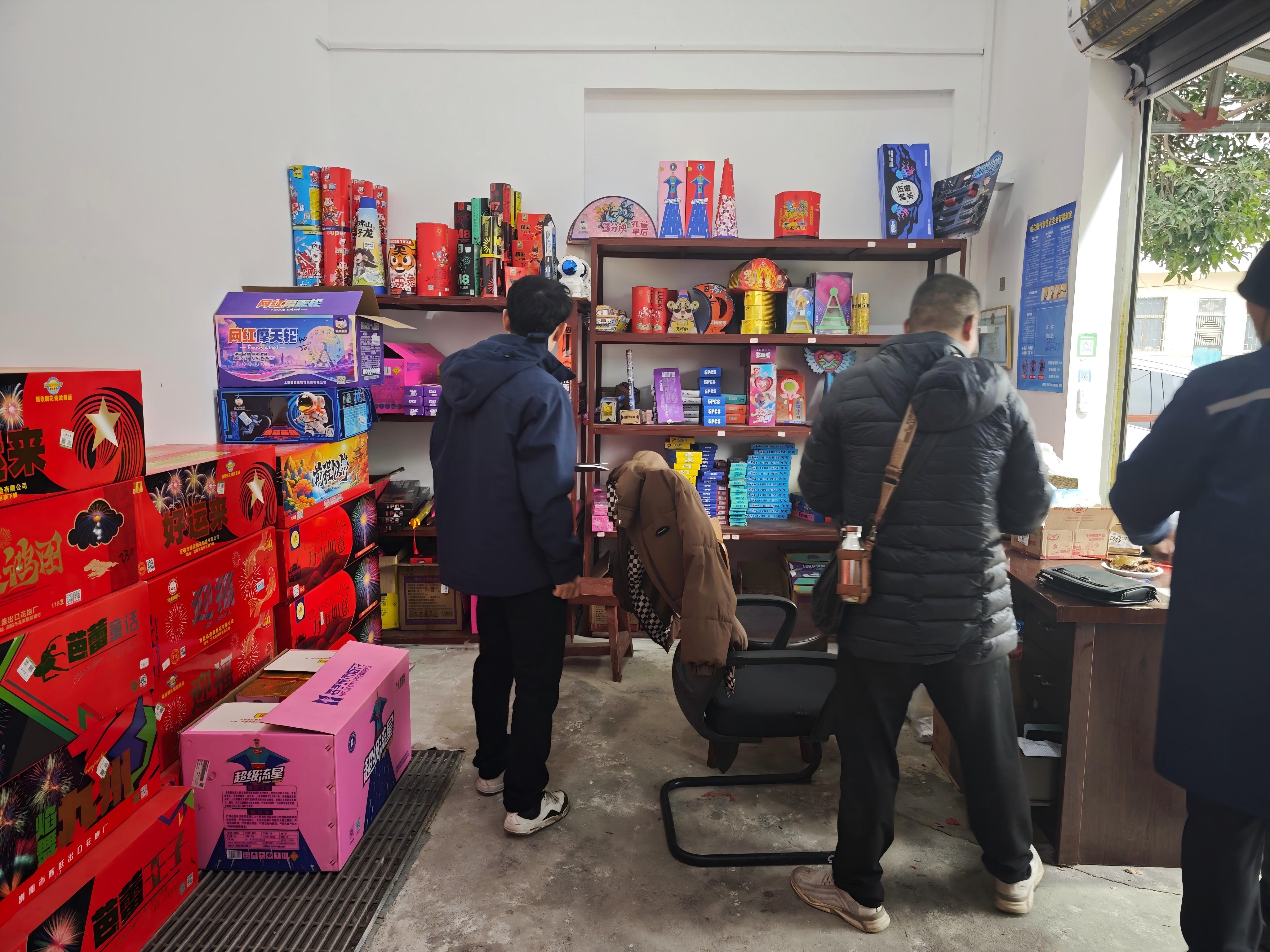 执法人员深入一线,对烟花爆竹经营单位安全现状进行查看,重点核查门店的安全设备、设施是否符合国家有关标准和规范,以及烟花爆竹门店是否销售非法渠道烟花爆竹货物,烟花爆竹存放是否超量等关键方面。