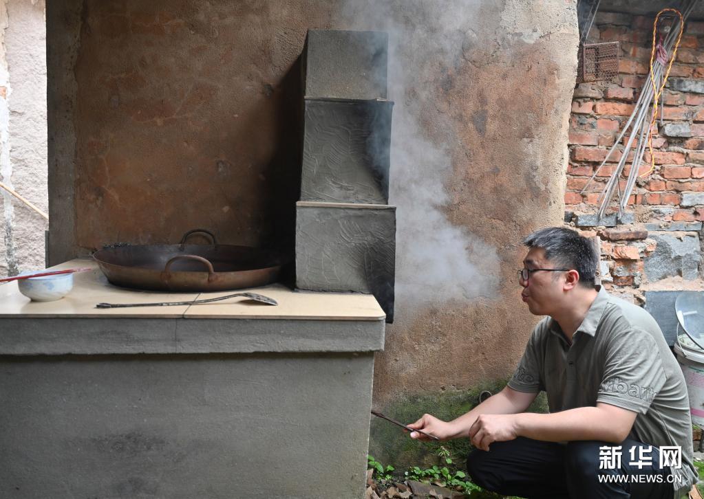 5月21日,在福建省福州市长乐区古槐镇高楼村,陈国锐生火准备熬制作为粘合剂的米糊。新华社记者 宋为伟 摄