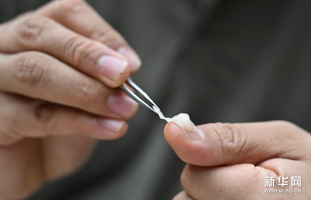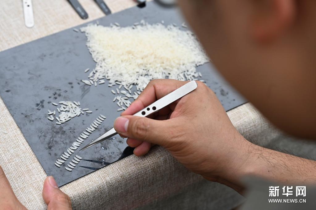 5月21日,在福建省福州市长乐区古槐镇高楼村,陈国锐将挑好的米粒排列整齐。制作高楼米线的米粒不宜太短,且对透明度和完整度有一定要求。新华社记者 宋为伟 摄