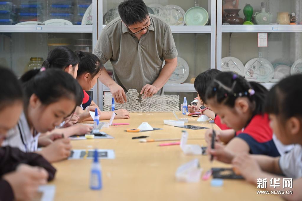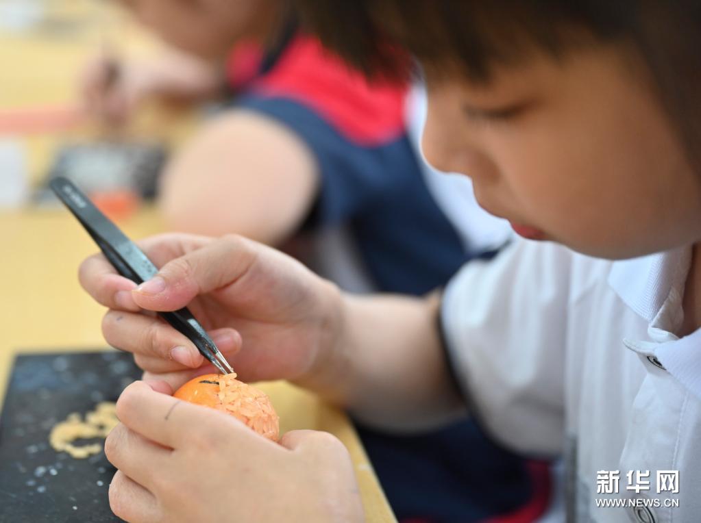 5月21日,在福建省福州市长乐区古槐中心小学,学生利用柿子模型制作高楼米线工艺品。新华社记者 宋为伟 摄