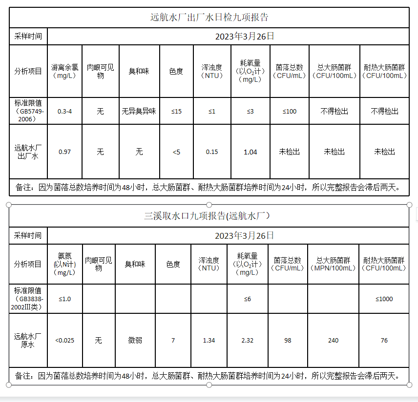长乐远航供水公司2023年3月26日水质检测报告