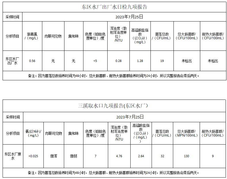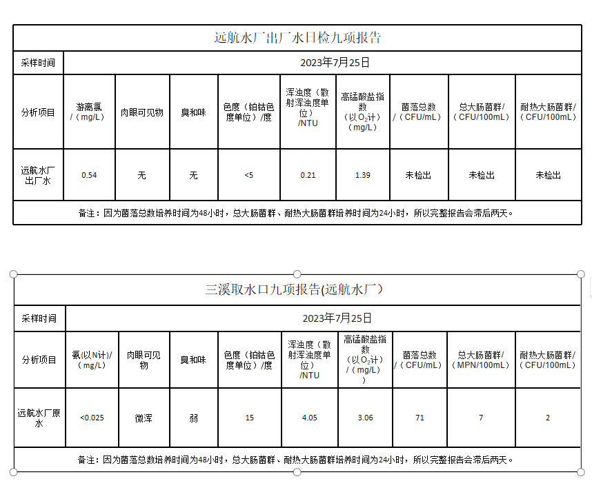 长乐远航供水公司2023年7月25日水质检测报告