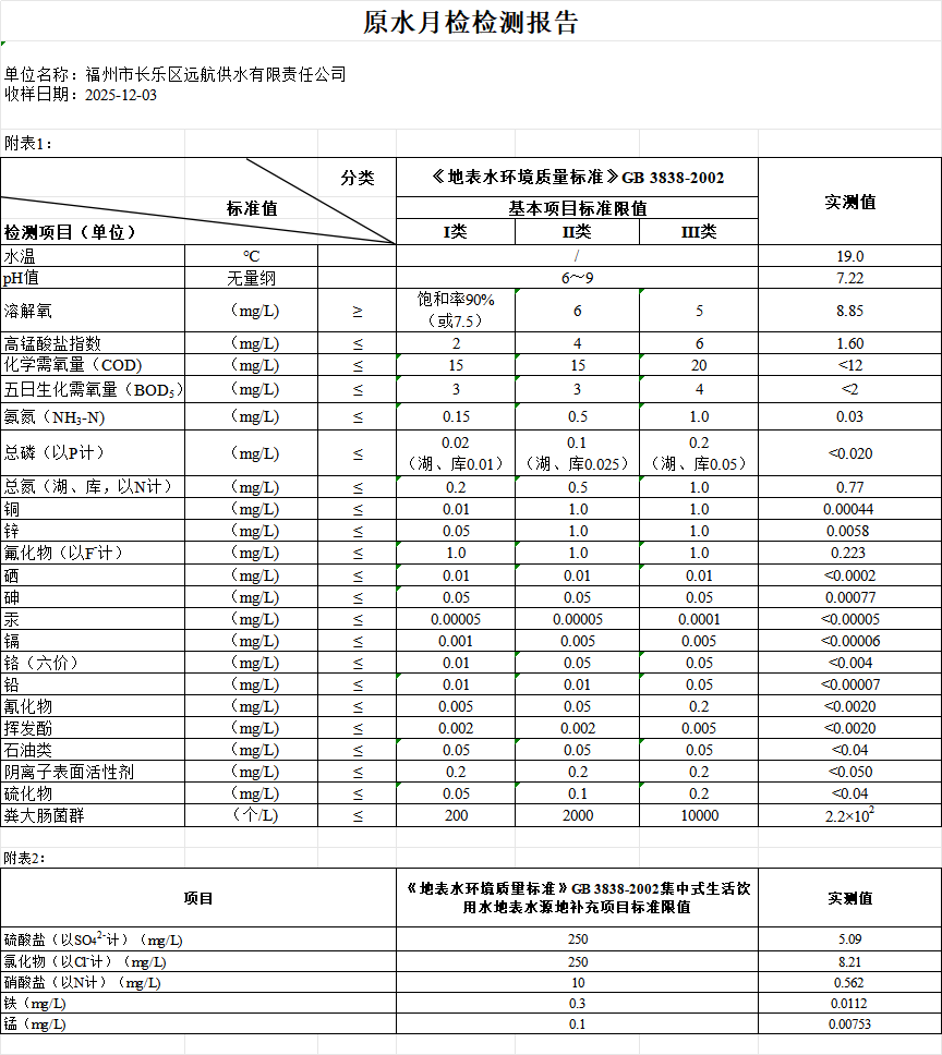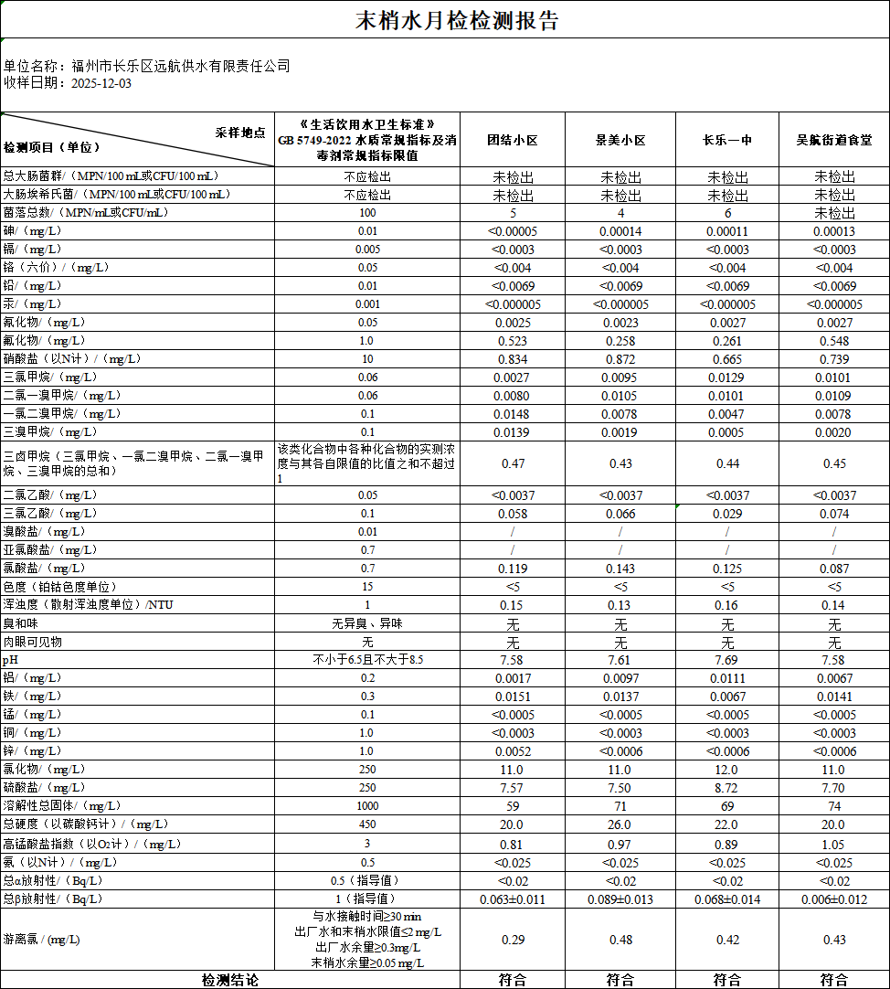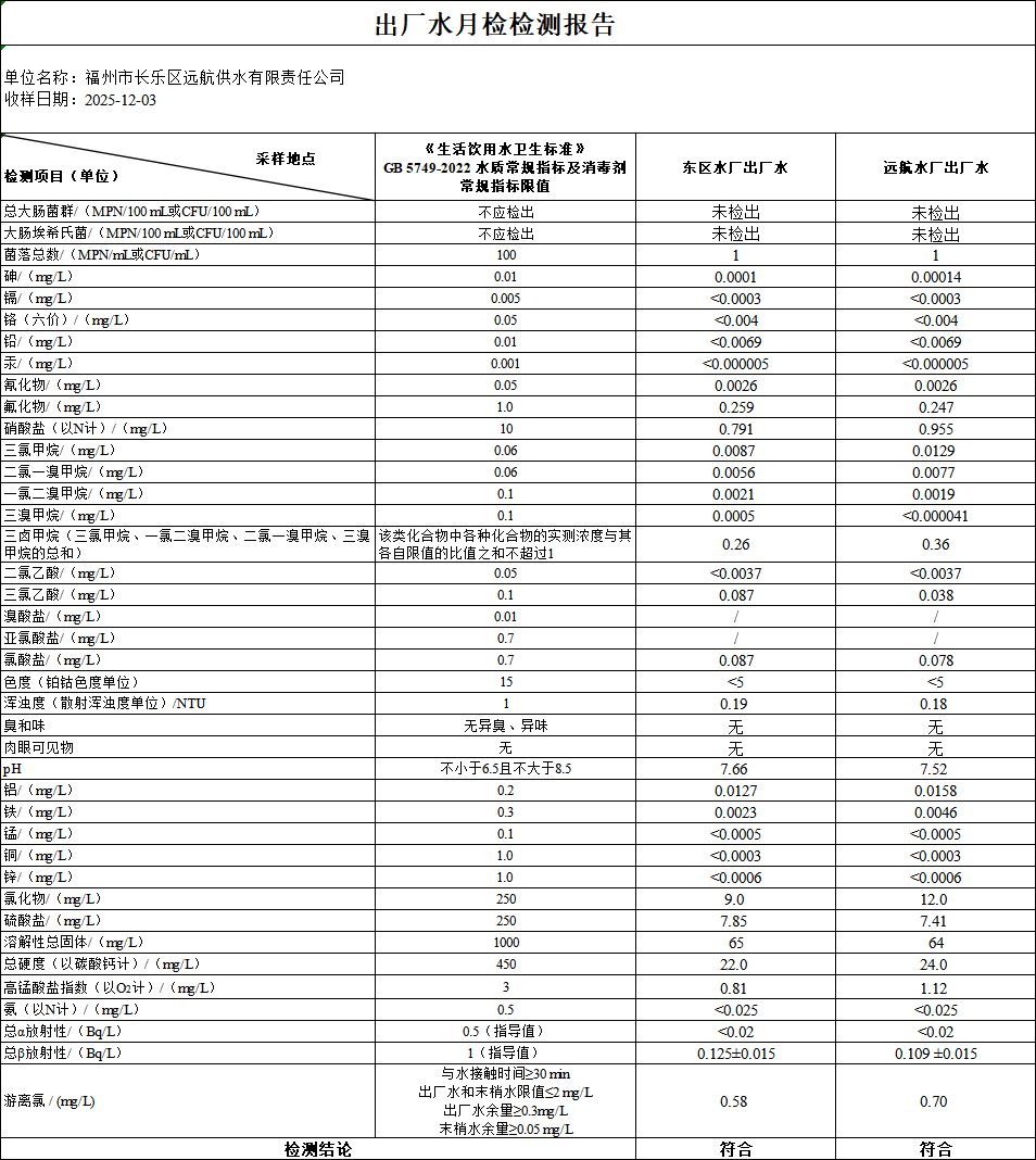 福州市长乐区远航供水有限责任公司所属两座水厂均采用国内先进的生产工艺和PLC自动控制技术,生产全过程设置国际一流水质在线监测仪器设备进行全程监控,源水来自大樟溪水源,取水口为闽侯三溪口水库。公司设有三级化验体系,担负水厂原水,出厂水、管网水的全程水质检测任务,实现水质的三重把关。我司水质监测中心按CJ/T206-2005《城市供水水质标准》标准规定对各类水进行检测,检测结果符合GB5749-2022《生活饮用水卫生标准》。 原水,出厂水,管网水月检情况:原水检28项,出厂水检38项,管网水检38项,且每半年两厂出厂水、管网水全分析检测(97项中的92项)。