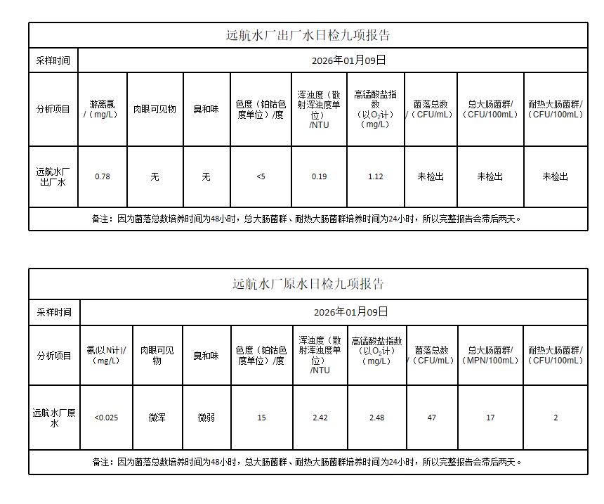 长乐远航供水公司2026年1月9日水质检测报告