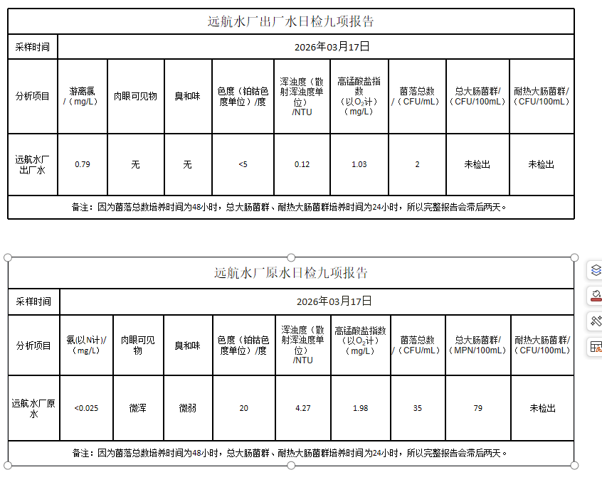 长乐远航供水公司2026年3月17日水质检测