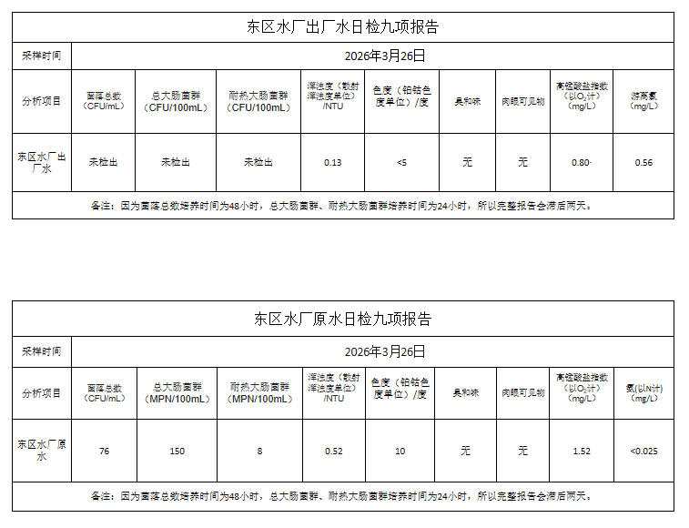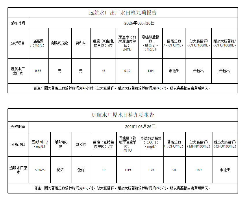 根据《福建省城市供水水质信息公开暂行管理办法》,为加强供水公司水质管理,加大涉及百姓民生方面信息的公开力度,现将长乐远航供水公司远航水厂和东区水厂取水口原水九项及出厂水九项每日检测报告对外公开公示,接受广大市民监督。