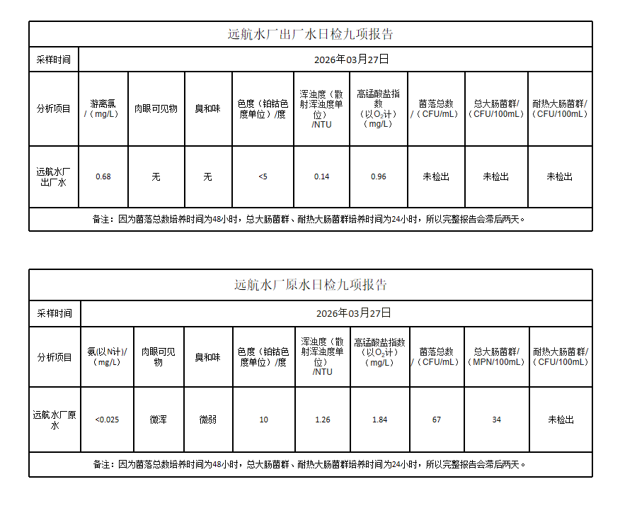 长乐远航供水公司2026年3月27日水质检测