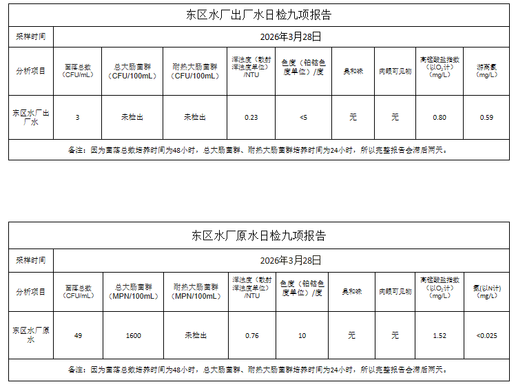 长乐远航供水公司2026年3月28日水质检测