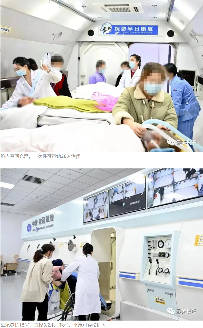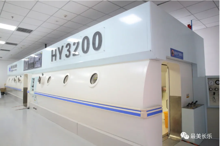 “高压氧舱群直径达3.2米,为 ‘三舱七门式’的设计,由大小不同的三个舱组成。既有可以让轮椅、平车、担架自由进出的大舱;同时,又有独立的小舱,能够为不同的人群提供更精准的个性化治疗。”