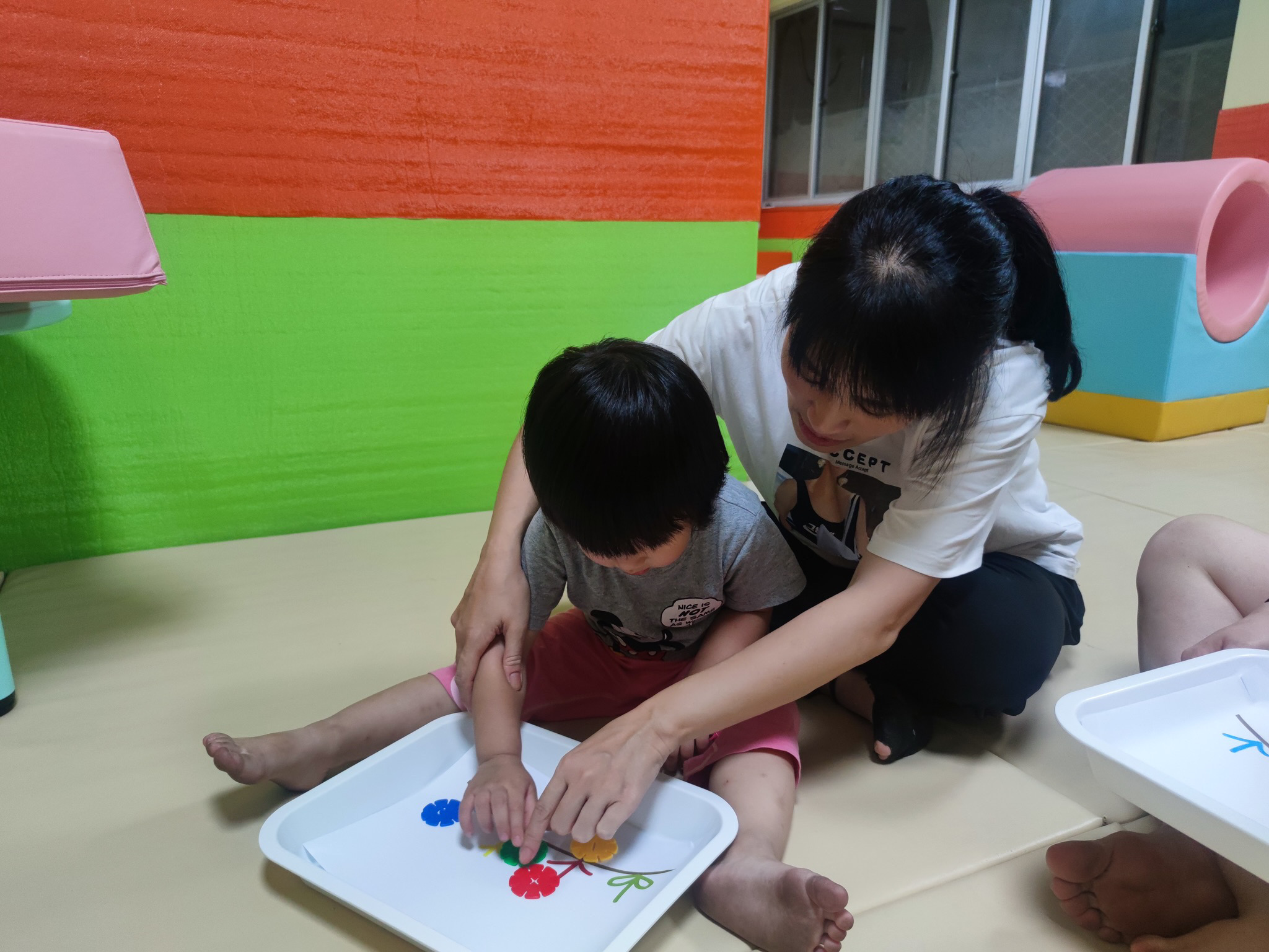 第三个游戏是认识颜色,由志愿者们引导家长们与孩子们将相同颜色的材料组合在一块,鼓励亲子们充分发挥自己的辨别颜色的能力和动手能力。拿到材料后,亲子们迫不及待地动起手来。五对亲子都能很好都将相同颜色的树叶与树干相匹配,强化了孩子们的注意力和集中力,锻炼了视觉判断能力和感知能力。