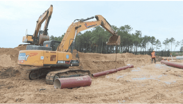 挖掘机、推土机正有序进行雨污水管道、路基回填等作业,现场在保证质量安全的前提下加快建设进度。