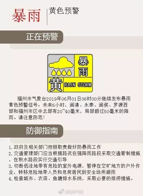 福州市气象台2019年06月01日06时00分继续发布暴雨黄色预警信号:未来6小时,闽清、永泰、闽侯、罗源西部和福州市区中北部有20~40毫米,局部超过50毫米的降雨。请注意防范!