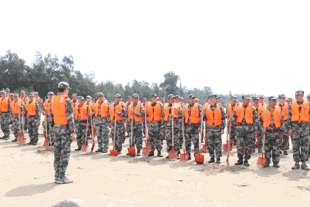 抢险救援队伍按照指令各司其职、紧密协作,迅速装沙袋、抬沙袋,及时对海堤进行封堵加固。