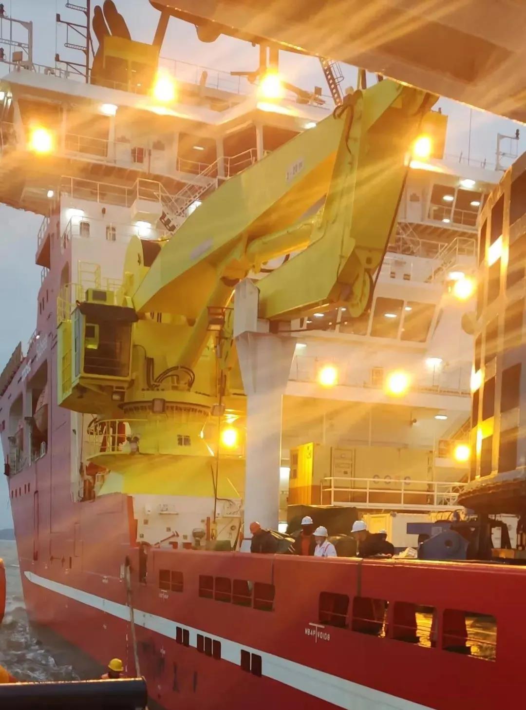 经过5个小时的海上颠簸,医护人员其实已经精疲力尽,但为了给企业排忧解难,他们稍作休息调整,克服晕船带来的身体不适,表示能全力完成此次出海送苗上船接种任务。与此同时,为了保障医护人员安全登船接种,三艘深水多功能工程船相互配合,船员们通力协作,通过吊笼将医护人员和防疫医疗物品从补给交通船安全转移到工程船上。